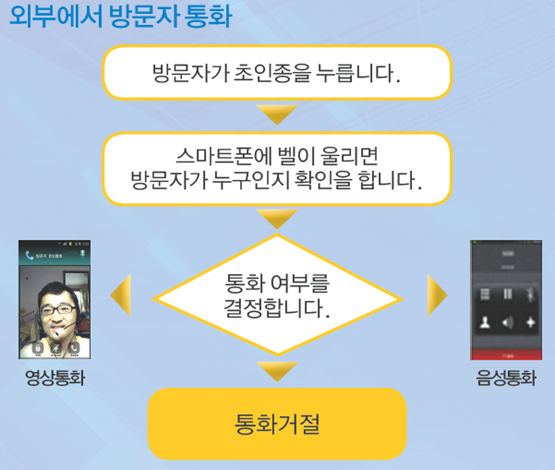 방문자가 있을 경우 공동현관문의 영상을 외부 스마트폰으로 영상통화 및 제어가 가능한 서비스